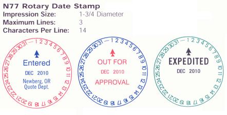 N77 Rotary Xpedater Date Stamp has a 1-3/16" diameter copy area (inside dial) You can select any available color for the outer ring and copy/date. The most common color combo is Red outer ring with Blue date an copy.